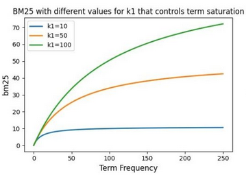 - In raw TF-IDF Term-Frequency (TF) linearly increases the score, but users perceive relevance with diminishing returns. The 20th mention of a term is less important than the 1st ⇒ Score should saturate