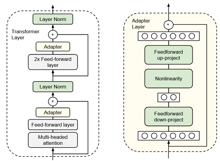 - Add a small trainable module inside each transformer layer. These are separate from the layers, unlike in LoRA